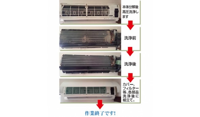 外装カバーの清掃 / フィルターの洗浄 / 本体内部の高圧洗浄 / ドレンパンの洗浄 / 作業に使用した場所の簡易清掃